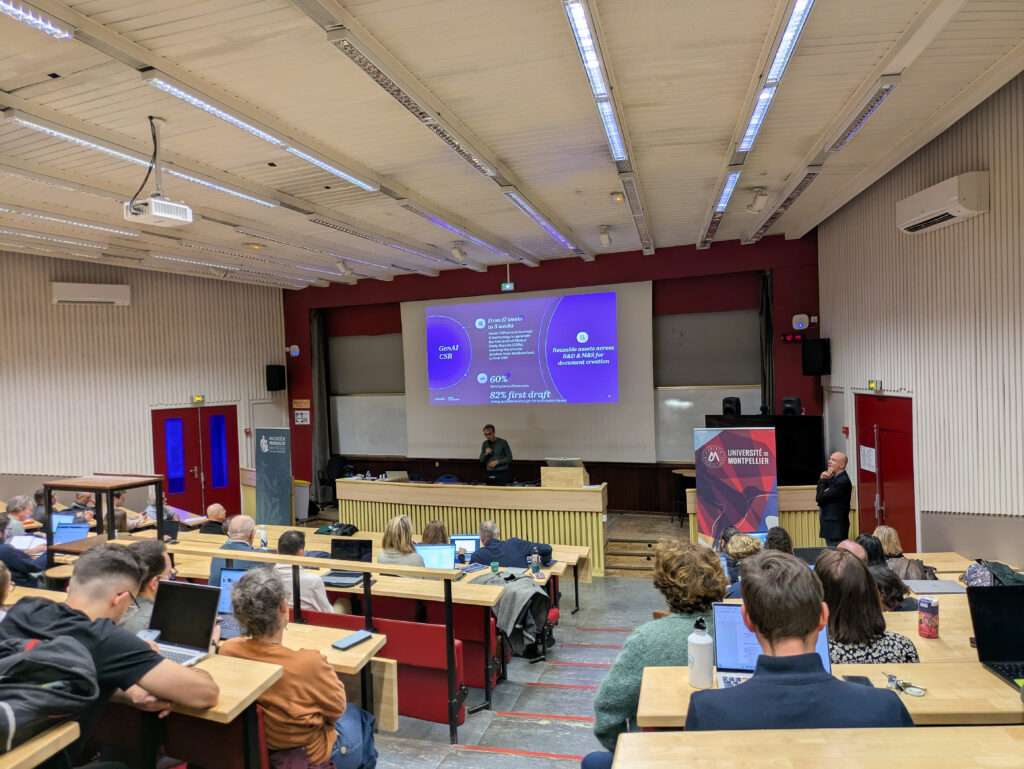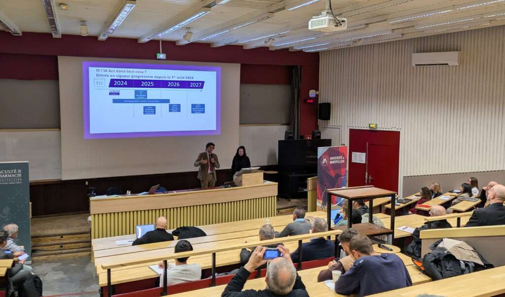 La matinée s’est ouverte par les interventions institutionnelles de Philippe Augé, Président de l’Université de Montpellier, et de Vincent Lisowski, Doyen de la Faculté de Pharmacie. David Cassagne, Vice-Président Numérique pour la Formation à l’Université de Montpellier, a ensuite présenté les actions et orientations stratégiques menées au sein de l’UM autour de l’intelligence artificielle.