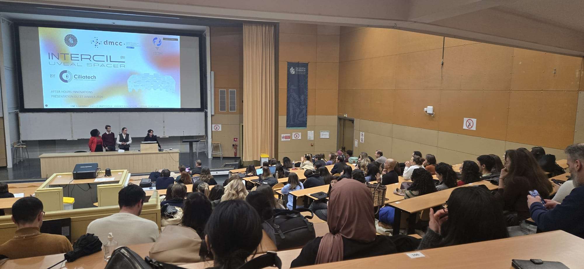 Les présentations ont donné lieu à des échanges riches et constructifs, témoignant de l’engagement, du professionnalisme et de la capacité des étudiants à répondre à des enjeux concrets d’innovation en santé. La soirée s’est conclue par un vote du public, permettant de valoriser le travail collectif des différents groupes.