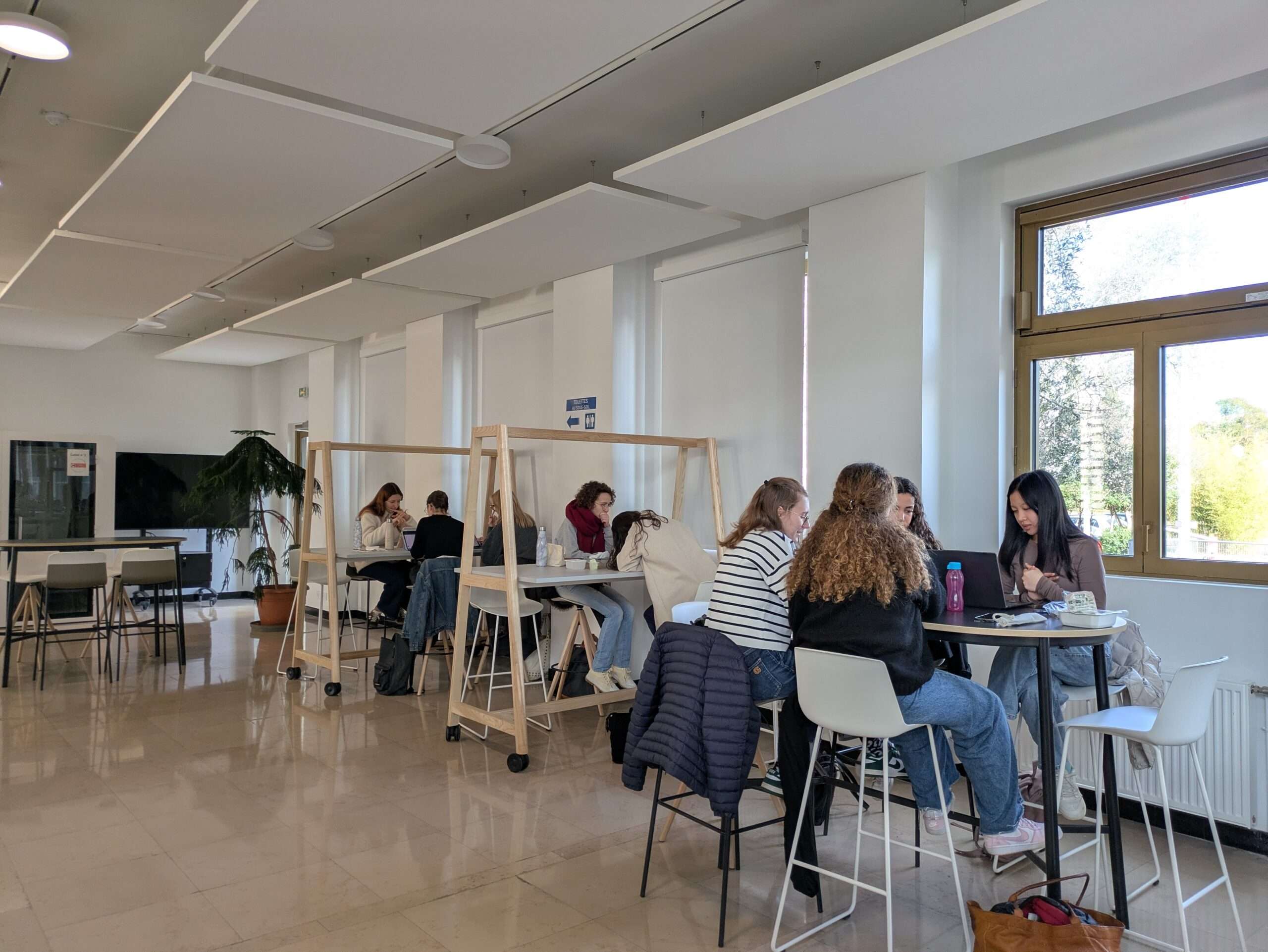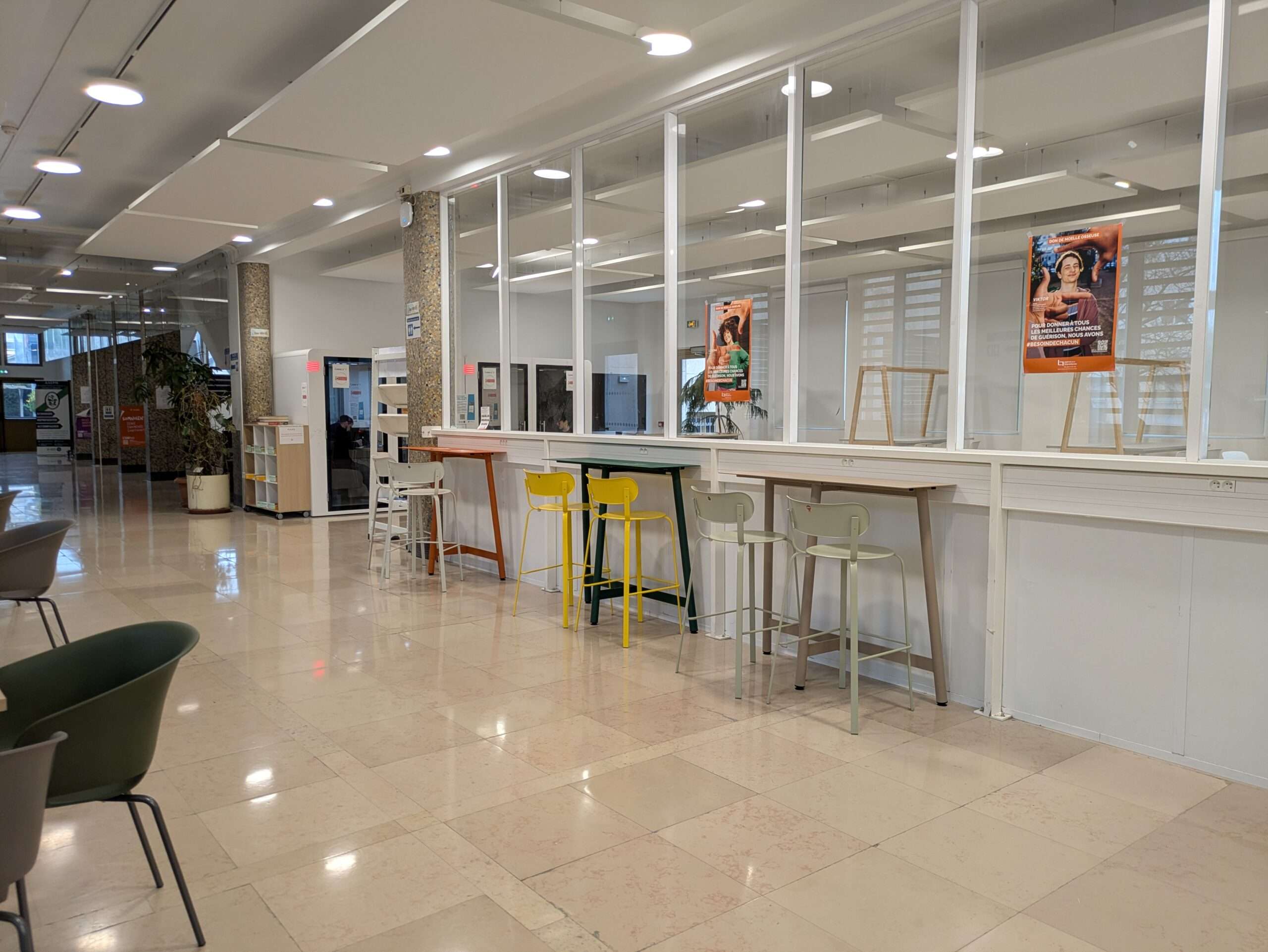 Le réaménagement du hall A repose sur des équipements adaptés aux usages quotidiens des étudiants. Du mobilier moderne et coloré a été installé, avec des tables hautes et longues pour travailler ou échanger en groupe, des tables basse et des bancs offrant une assise plus libre et conviviale.