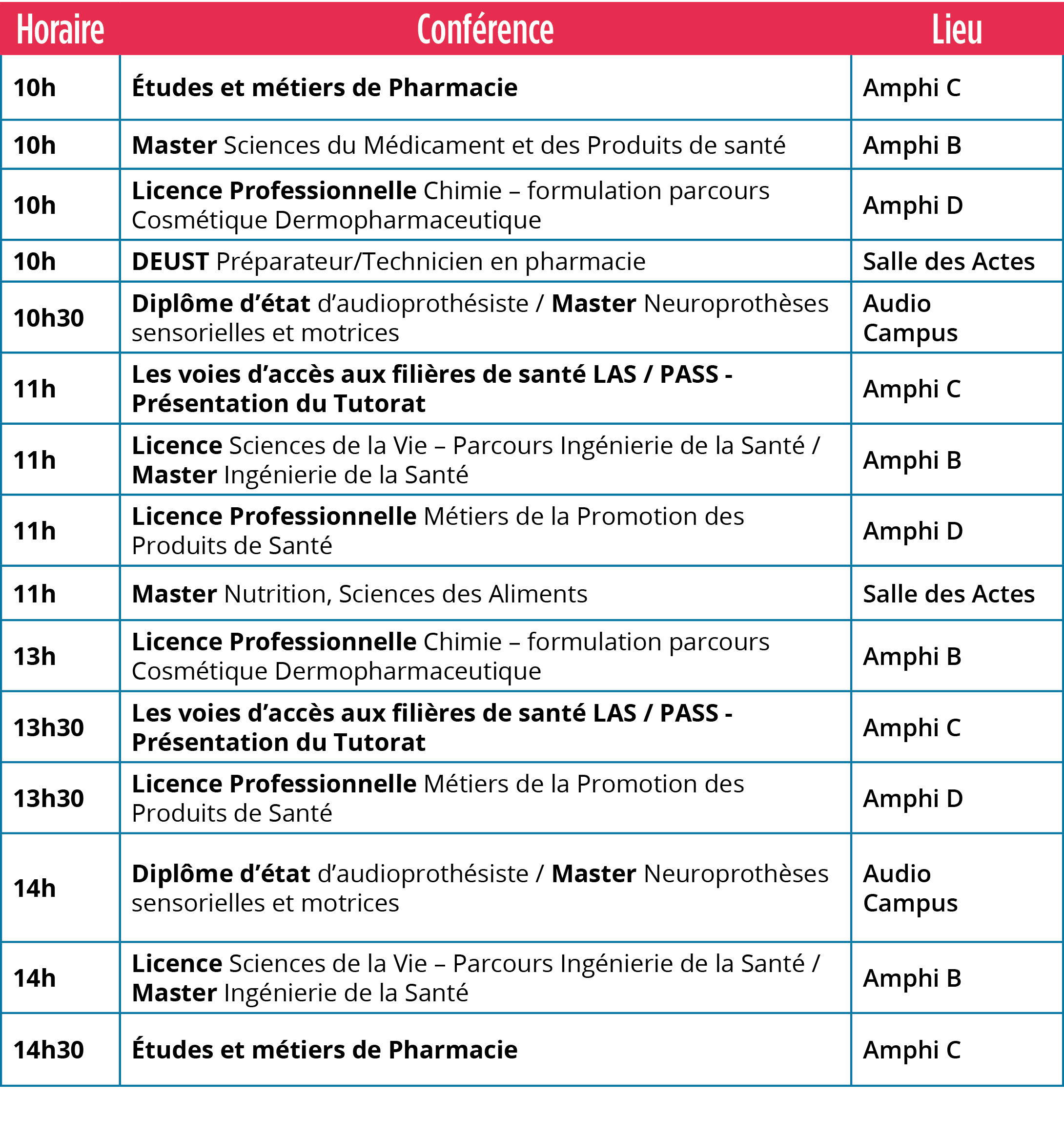 Conférences sur les formations de la Faculté de Pharmacie, visites de la Faculté avec les ateliers de travaux pratiques ainsi que les stands pour avoir toutes les informations sur nos diplômes !